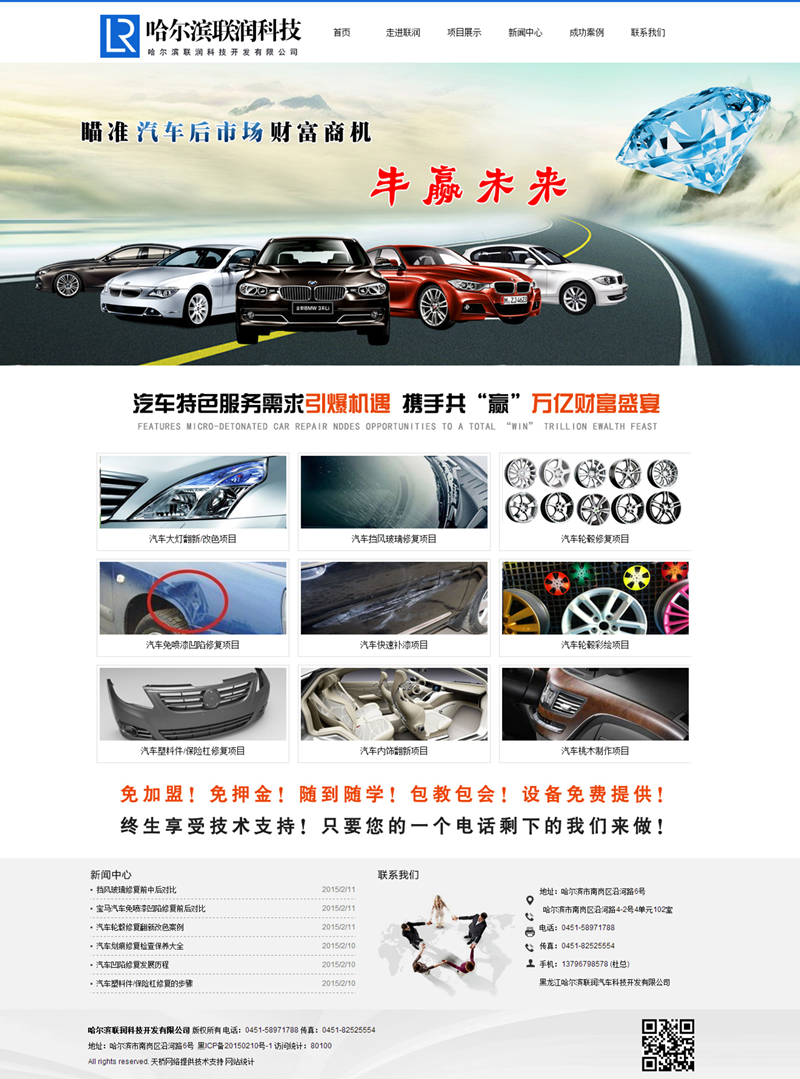 哈爾濱聯(lián)潤科技開發(fā)有限公司,是一家以:汽車大燈翻新/改色項目、汽車擋風(fēng)玻璃修復(fù)項目、汽車輪轂修復(fù)項目、汽車免噴漆凹陷修復(fù)項目、汽車快速補(bǔ)漆項目、汽車輪轂彩繪項目、汽車塑料件/保險杠修復(fù)項目、汽車內(nèi)飾翻新項目、汽車桃木制作項目為主的高科技汽車科研開發(fā)公司。